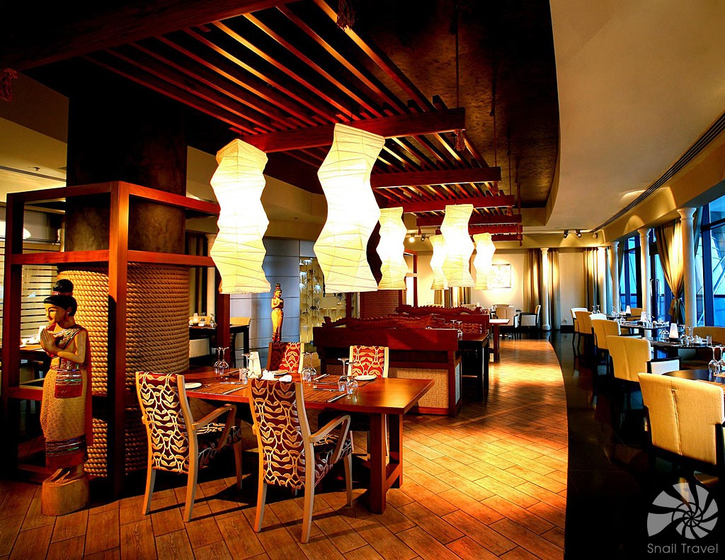 Le Méridien Al Aqah nabízí několik restaurací a barů, které zahrnují mezinárodní kuchyni, středomořské speciality, italské pokrmy i autentické indické menu. Hosté si mohou vychutnat snídani s výhledem na oceán, tematické večeře pod širým nebem nebo lehké občerstvení u bazénu. Každá restaurace má svůj styl a atmosféru, která přispívá k celkovému zážitku.